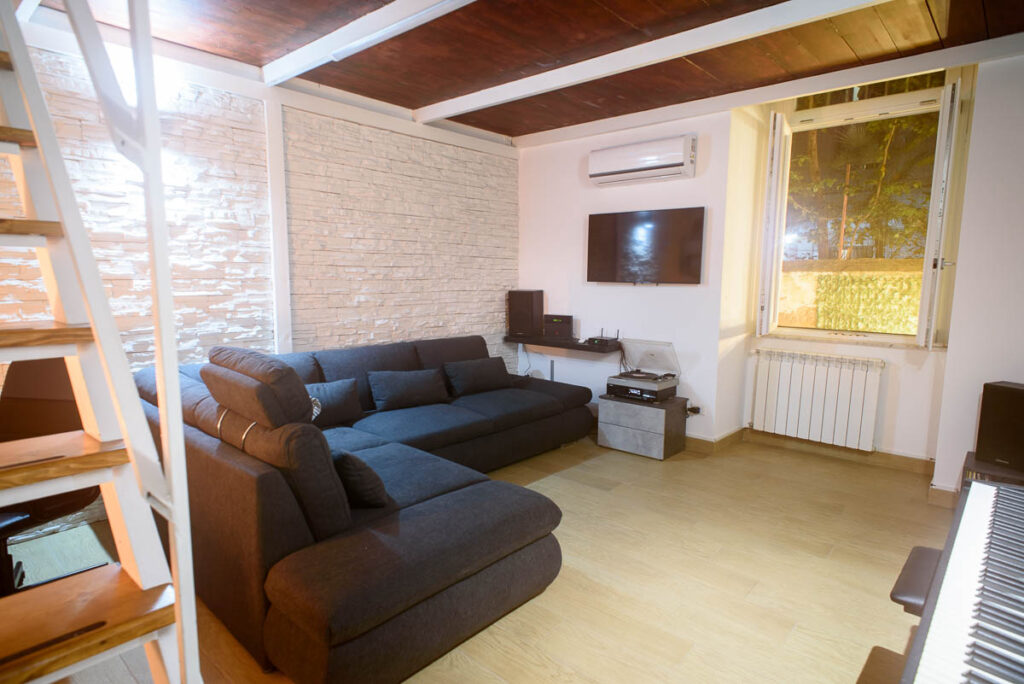 cucina e stoviglie; ampio salone living con comodo e spazioso divano (trasformabile, all’occorrenza, in ampio letto per due persone), piccola biblioteca, TV digitale di 40 pollici, impianto stereo con